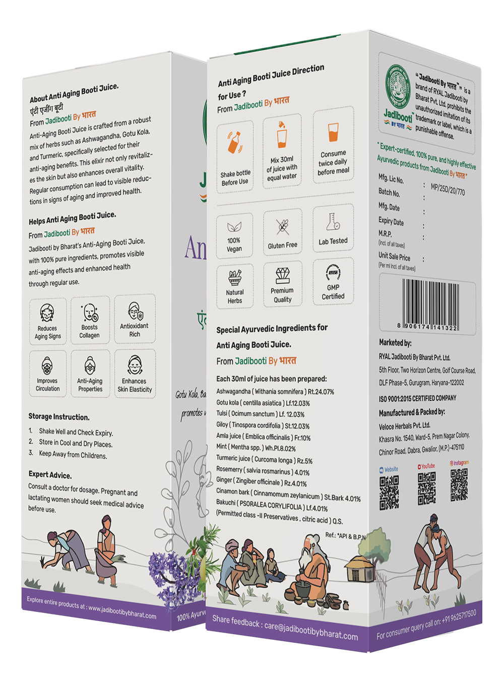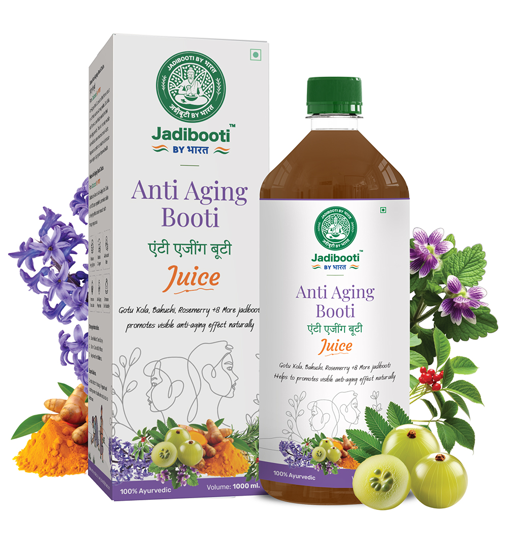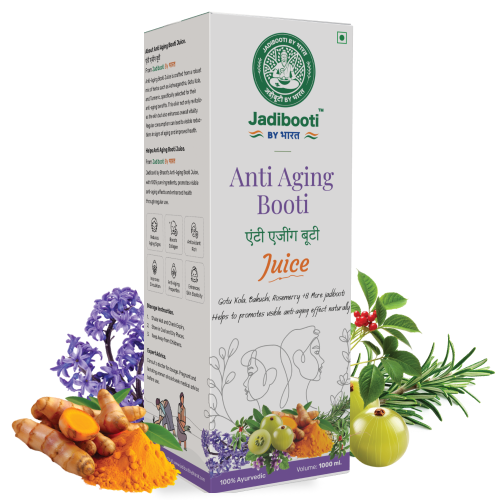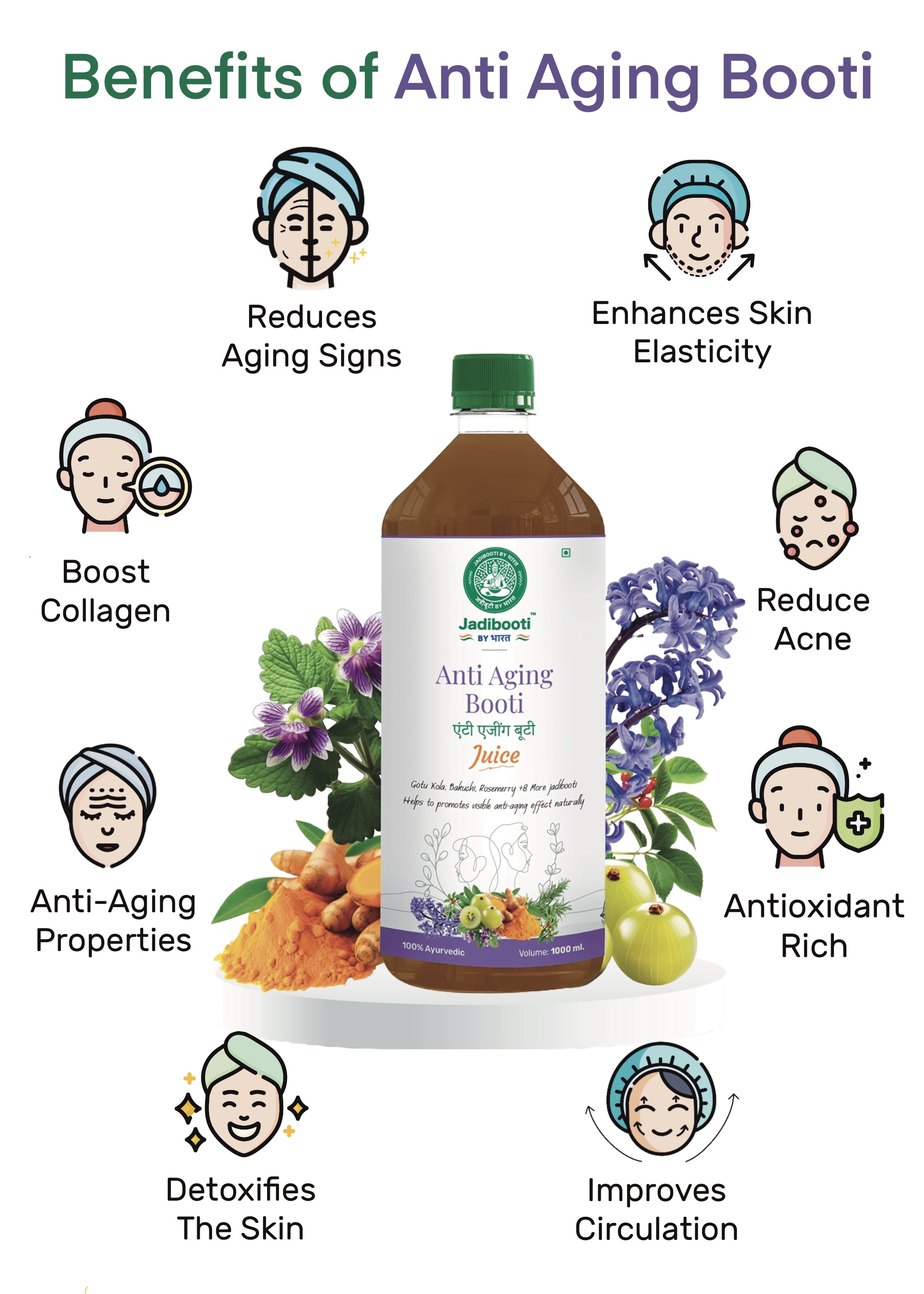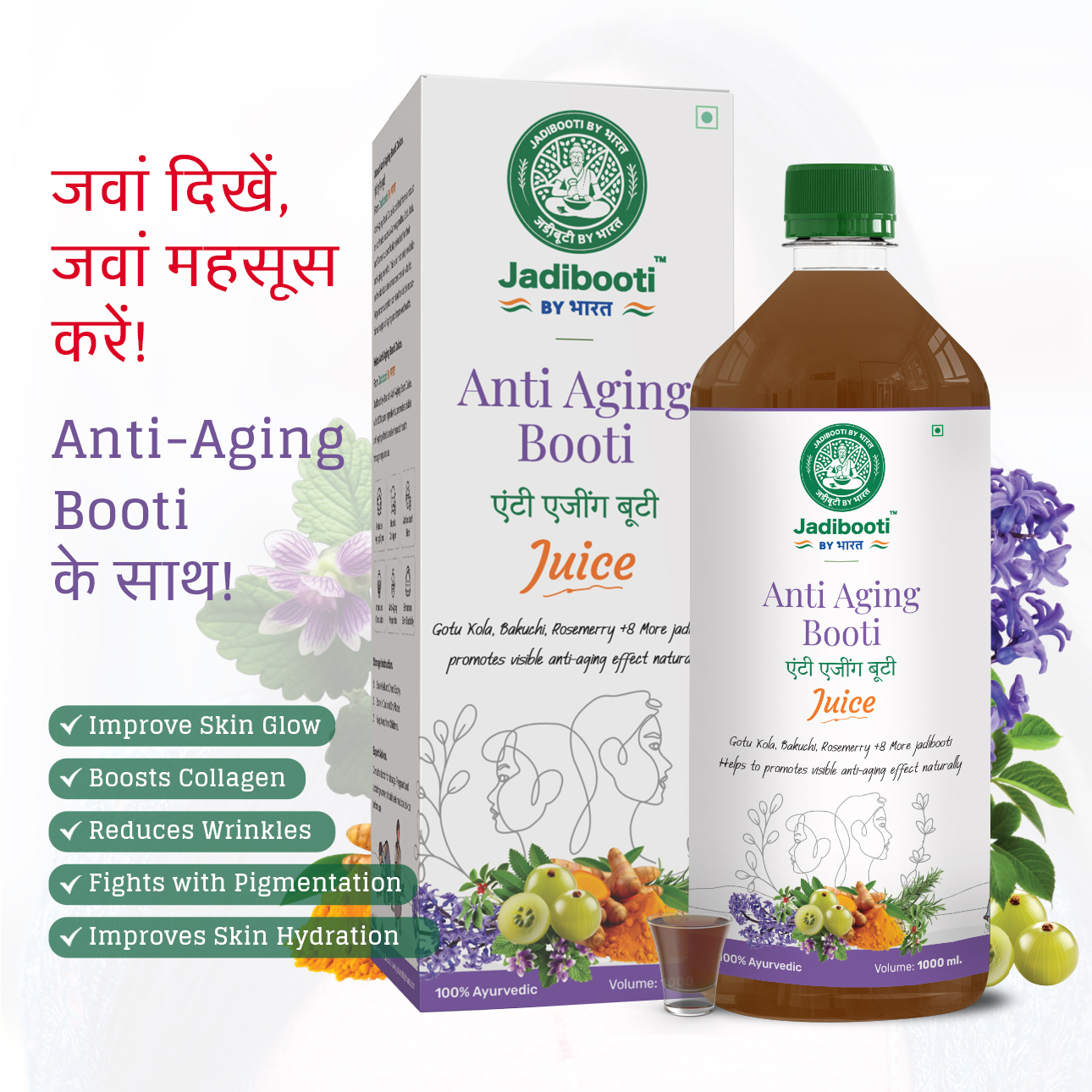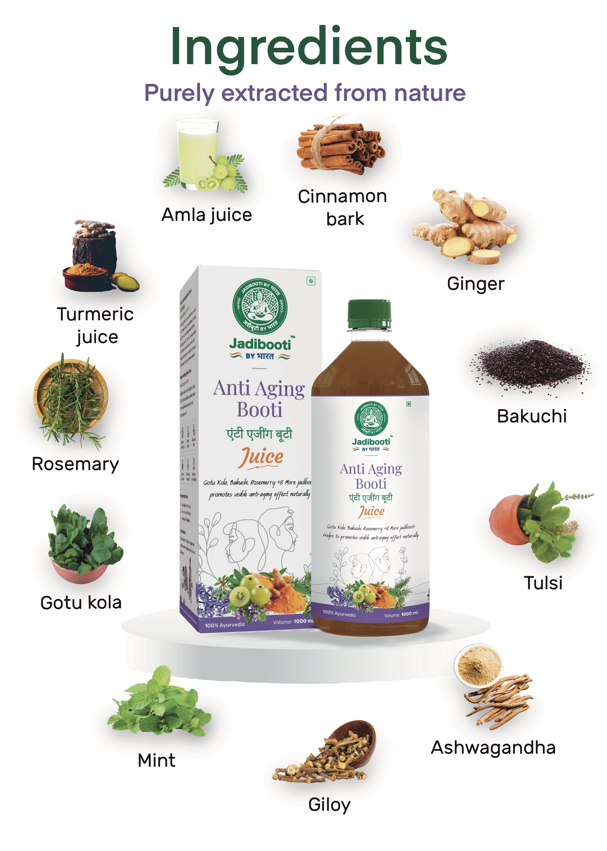 Unveil your inner radiance with Anti-Aging Booti Juice, a revitalizing Ayurvedic elixir crafted to reduce visible signs of aging and restore skin vitality from the inside out. This potent herbal blend features Ashwagandha, Amla Juice, Cinnamon Bark, Ginger, Bakuchi, Turmeric Juice, Rosemary, Tulsi, Mint, and Giloy—each selected for their antioxidant-rich, skin-enhancing properties. Whether you're exploring anti ageing treatment at home, seeking a natural collagen supplement, or looking for a remedy for pigmentation on face, this elixir offers a complete path to glowing, youthful skin.